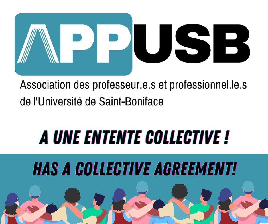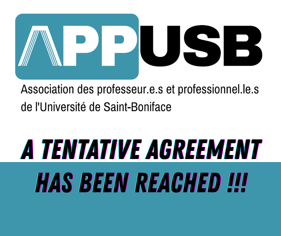 The APPUSB members have voted electronically and they have adopted a new collective agreement. This agreement allows for a return to pay parity, a more balanced teaching load, and provides for a joint committee whose objective is to restore within the university.